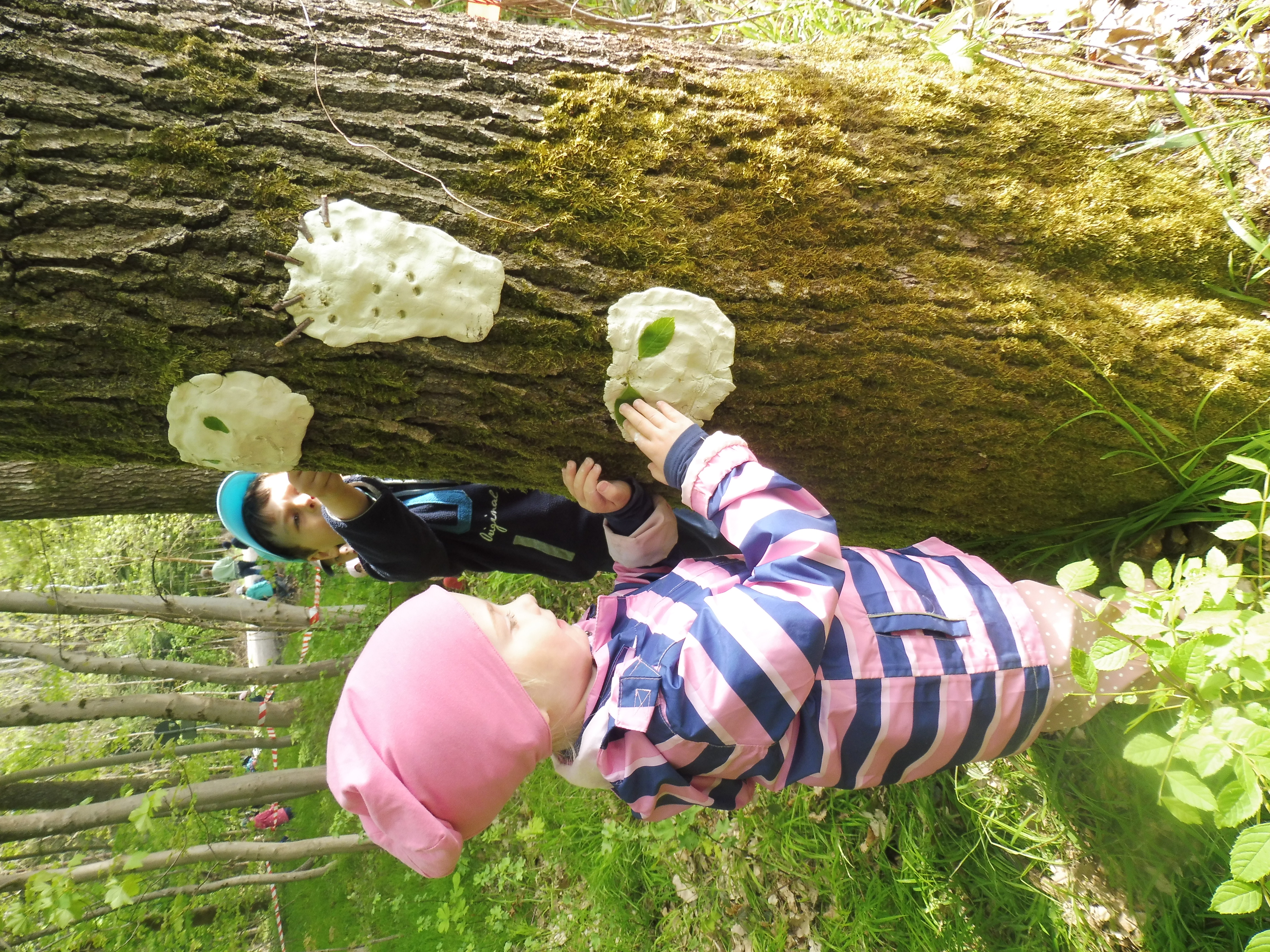 jedes Kind ein „Gesicht“ formen. Diese „Ton-Gesichter“ wurden an einen Baumstamm gedrückt und nun mit allem möglichen, was es im Wald zu finden gibt, verziert. So entstand aus einer Nussschale schnell eine dicke Knubbelnase, Grashalme und kleine Stöckchen bildeten die Haare oder einen Mund und wer noch das passende Material für zwei große Ohren suchte, wurde bei den vielen heruntergefallenen Blättern auf dem Boden schnell fündig. So lugten bald hinter vielen Baumstämmen die lustigsten Gesichter hervor, sodass sich bestimmt so mancher Spaziergänger sehr gewundert haben wird, wer denn dort im Wald am Werke gewesen war. Leider, so wurde auch den Kindern klar, würden die „Gesichter“ im Wald nicht von langer Dauer sein, da spätestens beim nächsten großen Regenschauer der Ton von den Baumstämmen heruntergewaschen würde. Da es sich aber bei allen Sachen um Naturmaterialien handelt, würde dies dem Wald aber überhaupt nicht schaden.