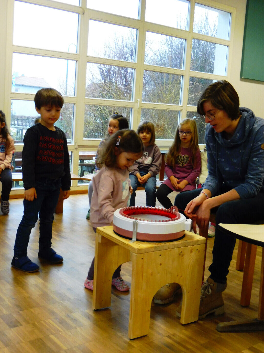 Kaum hat das neue Jahr begonnen, da fällt endlich der lang ersehnte Schnee! Schneemann bauen, Schlitten fahren, Schneeballschlacht - alle Kinder wollen draußen sein und das natürlich warm eingepackt mit Handschuhen, Schal und Mütze. So gibt es auch im Kindergarten in Röttbach die unterschiedlichsten Schals und Mützen zu bestaunen, egal ob mit Peppa Wutz, Paw Patrol oder Glitzereinhorn. Aber genauso cool wie so ein gekaufter Schal ist natürlich ein selbstgestrickter. So zeigte an einem Tag, kurz vor den Weihnachtsferien eines der Vorschulkinder ganz stolz einen selbstgemachten Schlauchschal, den es zu Hause mit einer Strickmaschine selbst angefertigt hatte. Aber was ist denn nun eigentlich eine Strickmaschine? Wie sieht diese aus? Und wie funktioniert sie? Diese Fragen beantwortete Anna Huth nur zu gerne und brachte neben ihrer Strickmaschine auch gleich eine Menge Wolle mit in den Kindergarten.